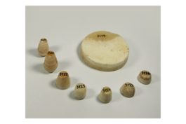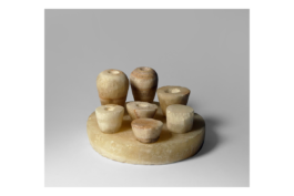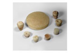 Die Gefäße stammen aus einem steinernen Statuenkasten und nicht wie sonst üblich aus der Sargkammer. Sie sind zudem in noch kleinerem Maßstab umgesetzt als gleichartige Modellgefäße jener Zeit. Man könnte das Ensemble als Miniatur-Modellgefäße oder aber auch als „Modelle von Modellgefäßen“ ansprechen. Die Gefäße stammen aus demselben Grab wie die Nachbildung eines Auges für eine Statue. (H.W.)