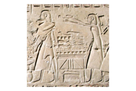 Sechs Modellgefäße, drei schwarze und drei weiße, stellen ein Set von Utensilien dar, das im Rahmen des bei der Bestattung an der Mumie zelebrierten Mundöffnungsrituals zum Einsatz kam. Die Gefäße sind in eine Platte eingelassen, die nach Vergleichsfunden modern rekonstruiert ist. Drei Vertiefungen deuten die heute nicht mehr vorhandenen Geräte dieses Sets an: zwei Klingen zum Öffnen des Mundes und ein Messer aus Feuerstein oder Obsidian mit gespaltenem Ende. Das Mundöffnungsritual diente zur Belebung des toten Körpers oder einer Statue. (H.W.)