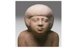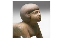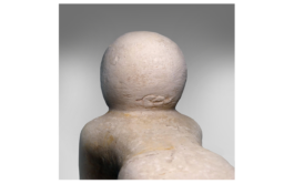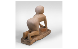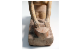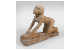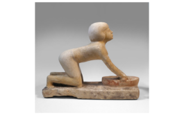 Rundbildliche Darstellung des Mahlens von Getreide mit einer Handmühle, ausgeführt von einer Frau in praktischer Kleidung. Mit beiden Händen erfasst sie einen halb walzenförmigen Stein – den beweglichen Läufer – und schiebt ihn über das Getreide, das auf dem unbeweglichen Mahlstein liegt, um es zu mahlen. Handmühlen wie diese entsprechen den gängigen Formen seit der Jungsteinzeit, z. B. auch in Mitteleuropa. (H.B./H.W.)