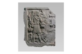 Dieses Relieffragment ist auf drei Seiten von einem glatten Rahmen umgeben und stellt wahrscheinlich ein Bildhauerlehr- oder Übungsstück dar. Ein gleichartiges Relief befindet sich im Ägyptischen Museum Berlin. Beide zeigen links einen mit Gefäßen beladenen Mann, der noch ein Kalb auf seinen Schultern trägt. Hinter ihm ist verkleinert eine Kuh zu sehen, die ein Kälbchen säugt. Der Stil der Darstellung ist typisch für das 4. Jh. v. Chr., als sich die ägyptische Kunst zunehmend mit hellenistischem Kultureinfluss auseinandersetzte. (H.B.)