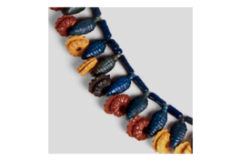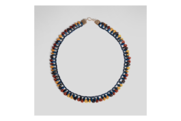 Die Halskette wurde aus in Modeln gefertigten Motiven und winzigen Perlen aus farbiger Fayence aufgefädelt. Besonders während der Zeit Echnatons wurden Motive aus der Natur nachgebildet, z. B. von Früchten und Blüten, die als Dekor verwendet oder zu kompliziert arrangierten, meist mehrfarbigen Halskragen und Halsketten verarbeitet wurden. Das Motiv der Weintraube war besonders beliebt. Charakteristisch ist die Farbwahl für Schmuck der Pharaonenzeit: Blau, Rot und Gelb, die im Idealfall durch Lapislazuli, Karneol und Gold repräsentiert sind. (H.W.)