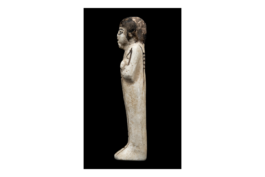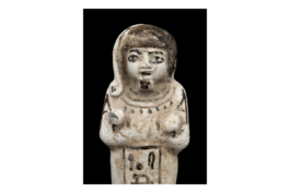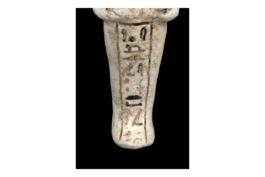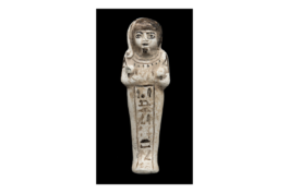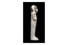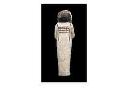 Diese Totenfigur bzw. Uschebti (d. h. „Antworter“) gehörte zur Grabausstattung des Chaemwese, eines der vielen Söhne von Ramses II.; Chaemwese war Hohepriester des Gottes Ptah und auch sein Uschebti trägt eine Seitenlocke, ein Kennzeichen dieser Priester. Auf magische Weise belebt, sollte die Figur anstelle des Chaemwese Arbeitsverpflichtungen im Jenseits übernehmen. Der Prinz ließ auf Befehl seines Vaters zahlreiche, teils uralte Kultbauten restaurieren und nicht zuletzt deshalb ist er im Gedächtnis der Nachwelt lebendig geblieben. (H.B.)