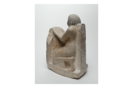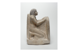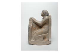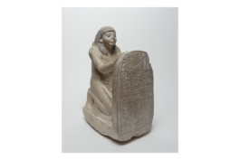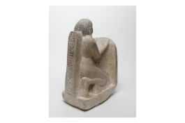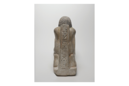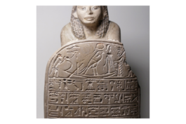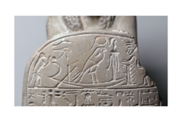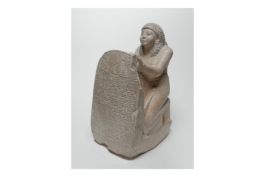 Die Statue stellt einen Tempelbeamten des thebanischen Gottes Amun-Re mit einem Denkstein (Stele) vor sich dar. Darauf ist eine hieroglyphische Inschrift eingraviert mit einem Hymnus an den aufgehenden Sonnengott Re-Harachte. In dem Bildfeld darüber ist das Schiff des über den Himmel „reisenden“ falkengestaltigen Gottes zu sehen. Statuen dieses Typs, sogenannte Stelophore, wurden in der Zeit des Neuen Reiches in Nischen gesetzt, die sich unterhalb der Spitze von Ziegelpyramiden befanden, die über den Gräbern errichtet wurden. (H.B.)